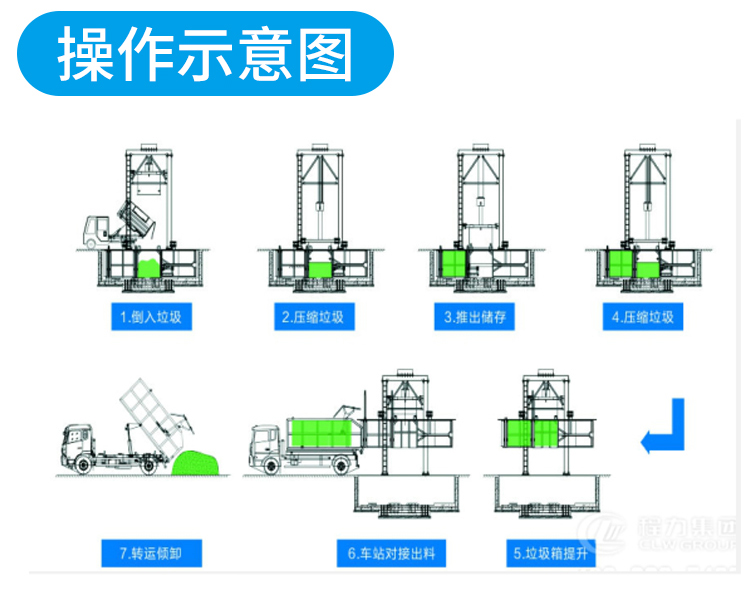 用于垃圾的儲存、壓縮及寄存全部在地面以下,地面上沒有垃圾散落。 采用垂直壓縮方式,壓縮力大,垃圾塊壓實密度大。